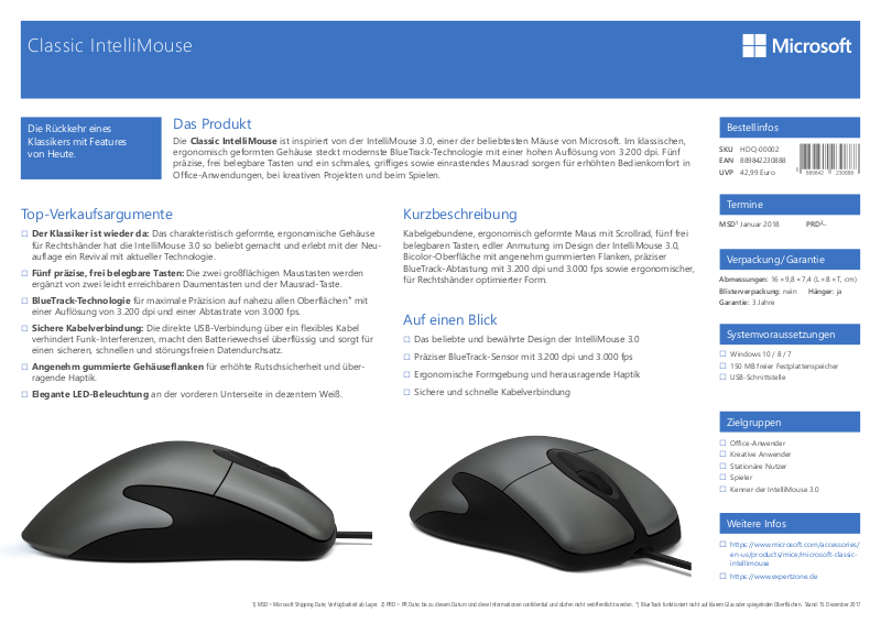1) MSD = Microsoft Shipping Date; Verfügbarkeit ab Lager. 2) PRD = PR Date; bis zu diesem Datum sind diese Informationen confidential und dürfen nicht veröffentlicht werden. *) BlueTrack funktioniert nicht auf klarem Glas oder spiegelnden Oberflächen. Stand: 15. Dezember 2017