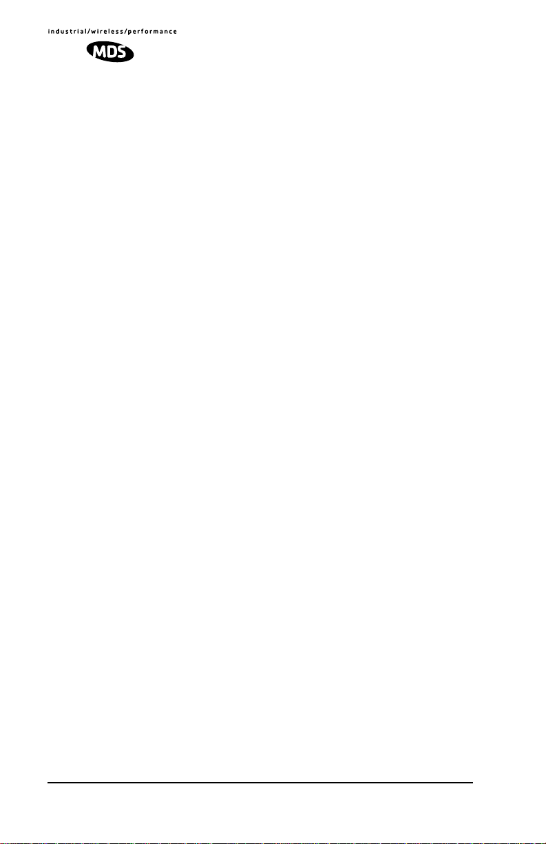 The MDS TransNET 900™ transceivers comply with Part 15 of the FCC Rules. Operation is subject to the following two conditions: (1) this device may not cause harmful interference, and (2)