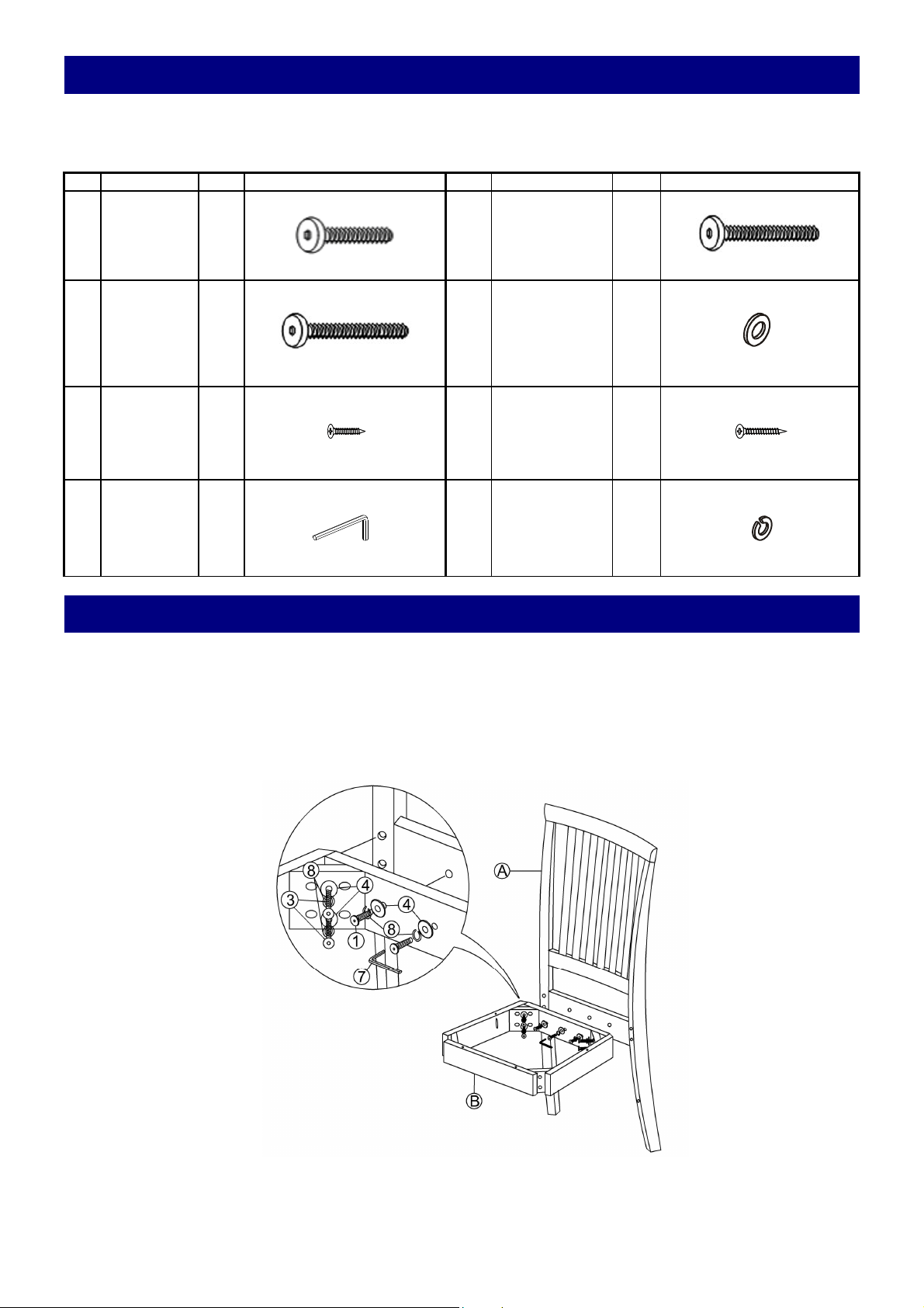 Attach front legs (E) to the seat frame with bolts (2) and washers (4) and (8) .Tighten with allen key