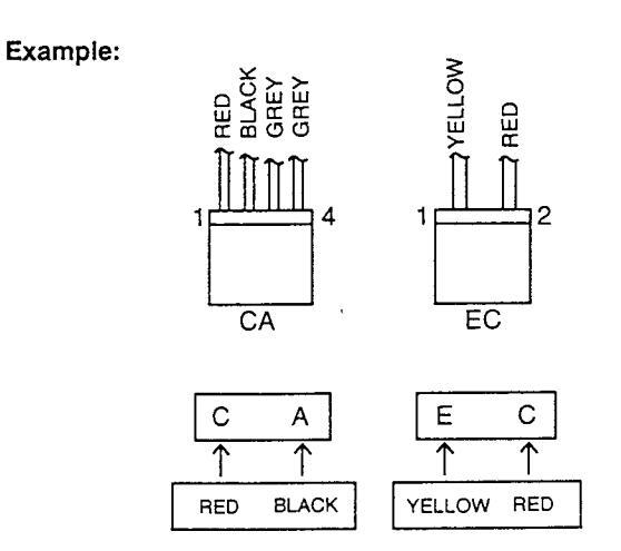 Lead connectors show the connector names by colour codes of leads, not printed any connector names. When connecting or removing them, identify connector names according to colour codes in the table below. Colour Codes (See Pin Nos. 1 and 2 of connectors)