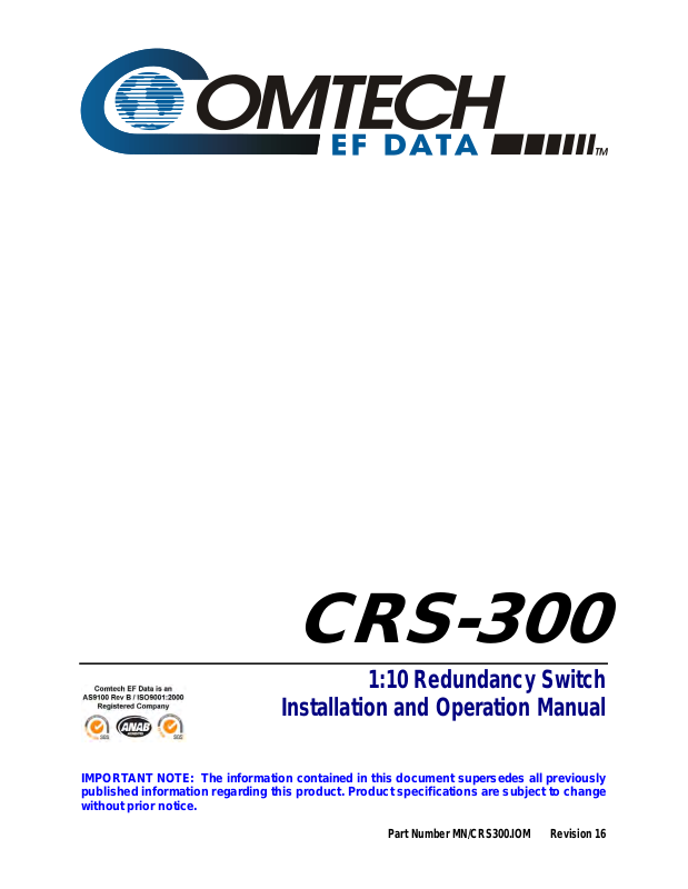 This manual provides installation and operation information for the Comtech EF Data CRS-300 1:10