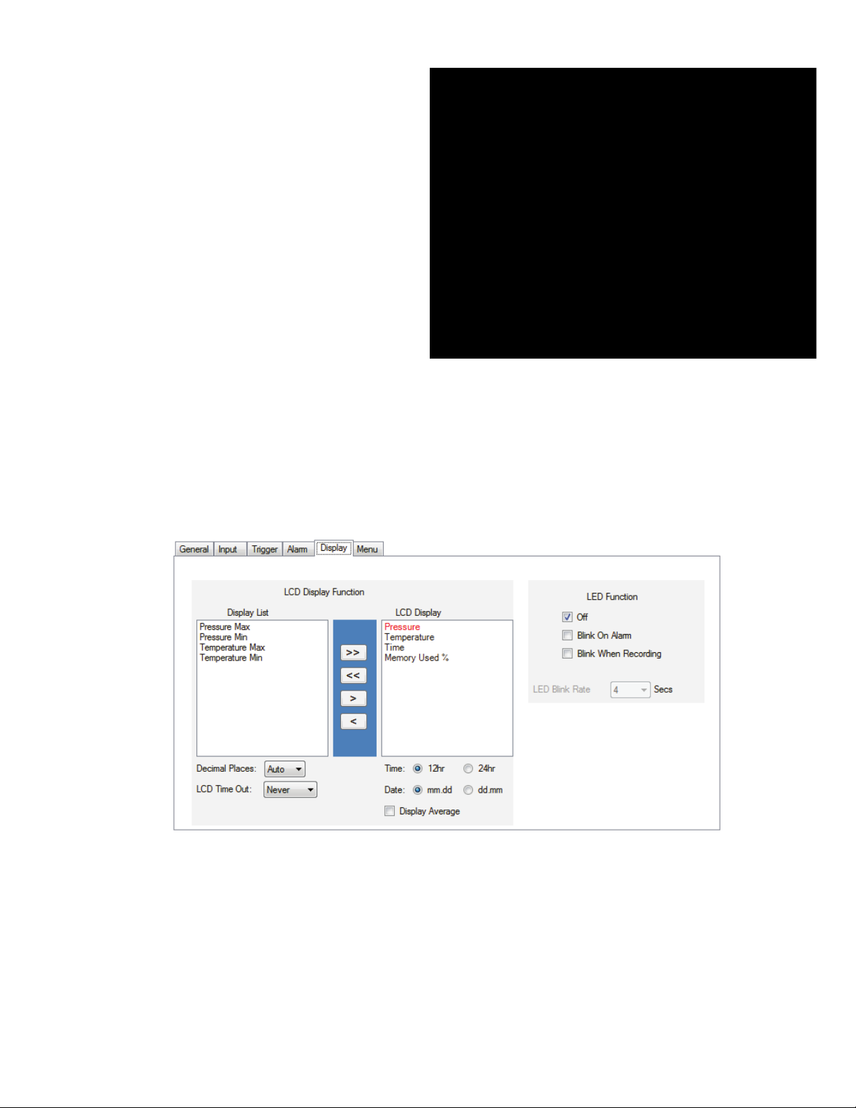 There are a number of unique options specifically for this Display Pressure Logger which are covered below.