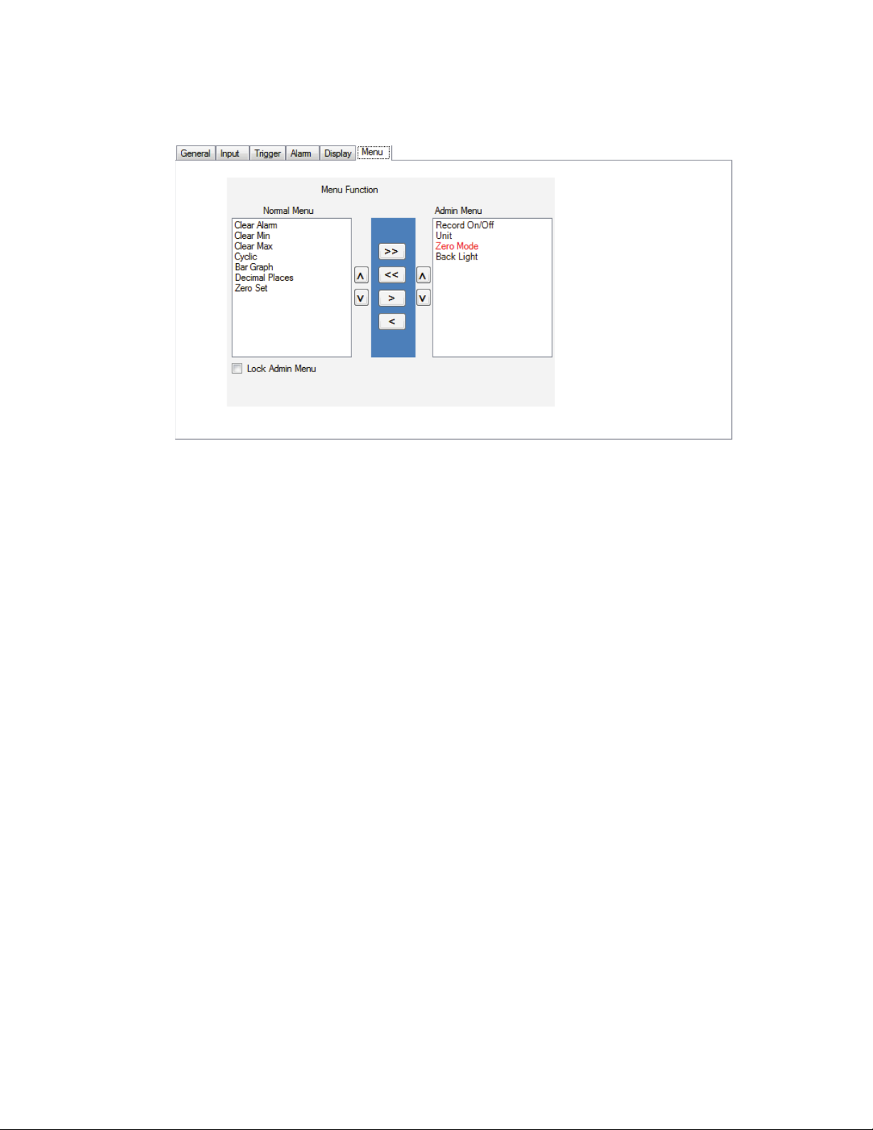 This setting allows the user to determine which menu functions appear in the Normal menu and which appear in the Admin menu.