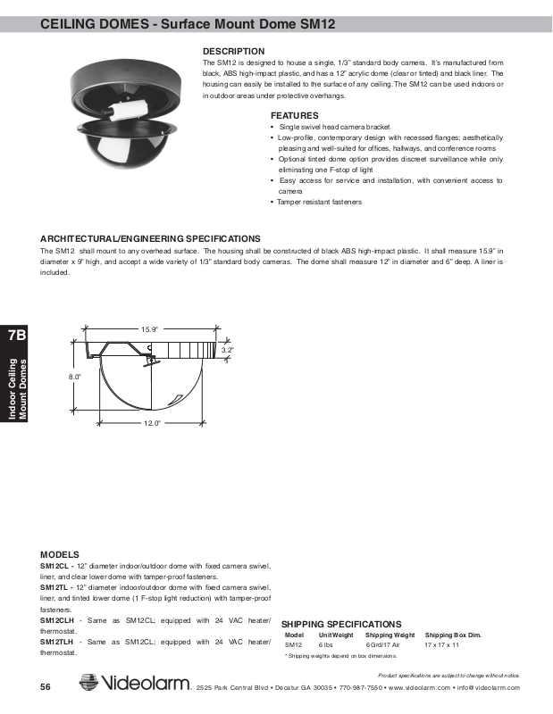 SM12CL - 12” diameter indoor/outdoor dome with fi xed camera swivel,