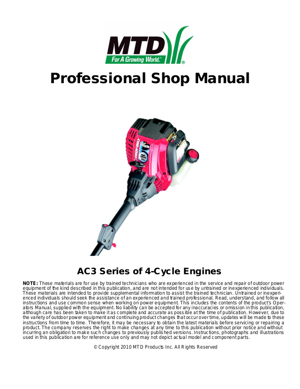 NOTE: These materials are for use by trained technicians who are experienced in the service and repair of outdoor power