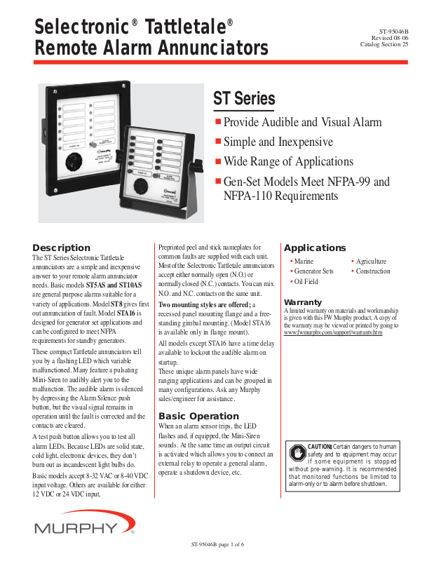 Murphy Basic ST-Series Selectronic Tattletale annunciators are used wherever a remote alarm and annunciation is required. Typical