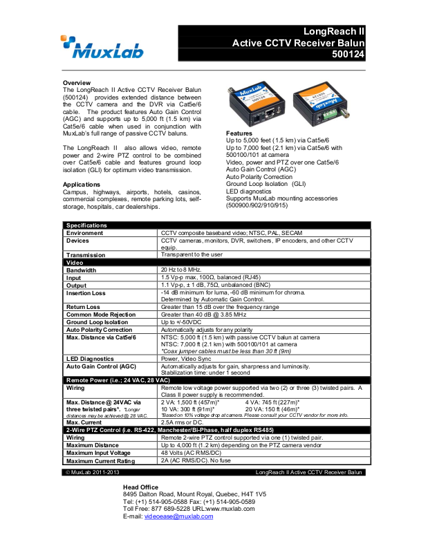 MuxLab 2011-2013 LongReach II Active CCTV Receiver Balun