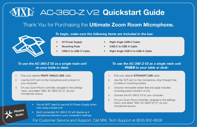 For Customer Service and Support, Call MXL Tech Support at (800) 800-6608