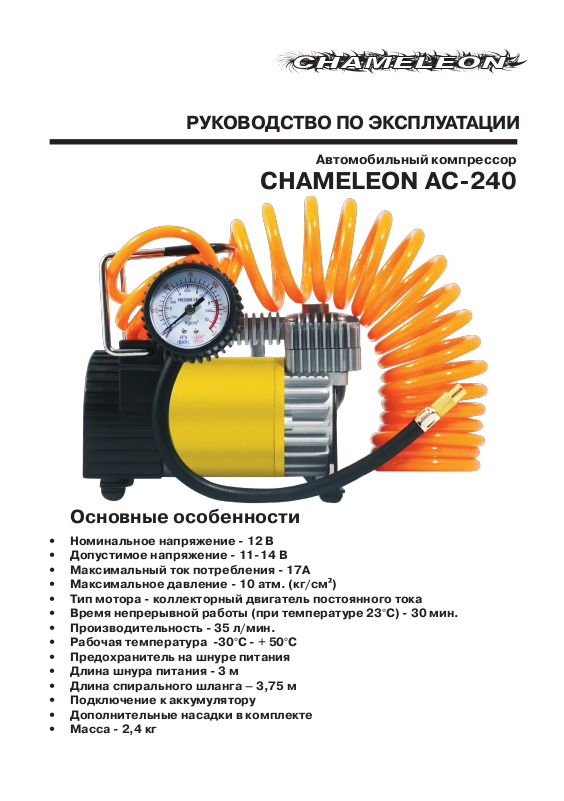 Благодарим Вас за покупку автомобильного компрессора CHAMELEON AC-240.