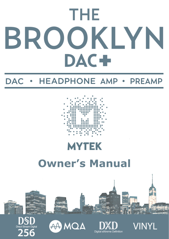 Thank you for choosing the Brooklyn DAC+ from Mytek Digital and welcome to the Mytek users' community. Over 20 years of experience in building mastering grade converters and other audio equipment has been utilized to create this digital to analog converter. Its sophisticated audio path is designed to deliver bit perfect, high quality, transparent sound to your speakers and headphones. The Brooklyn DAC+ will play:
