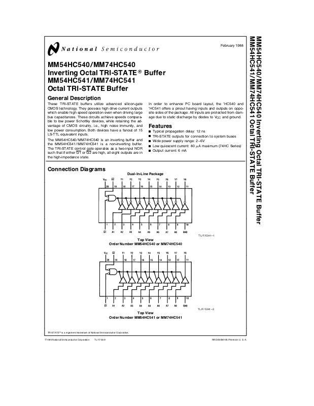 ’HC541 offers a pinout having inputs and outputs on opposite sides of the package. All inputs are protected from damage due to static discharge by diodes to V
