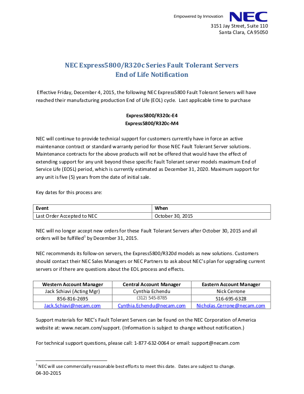 NEC will no longer accept new orders for these Fault Tolerant Servers after October 30, 2015 and all