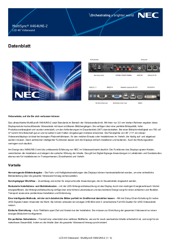 Am Design des X464UNS-2 wird die umfassende Erfahrung von NEC im Videowandmarkt deutlich: Die Funktionen des Displays sparen Kosten,
