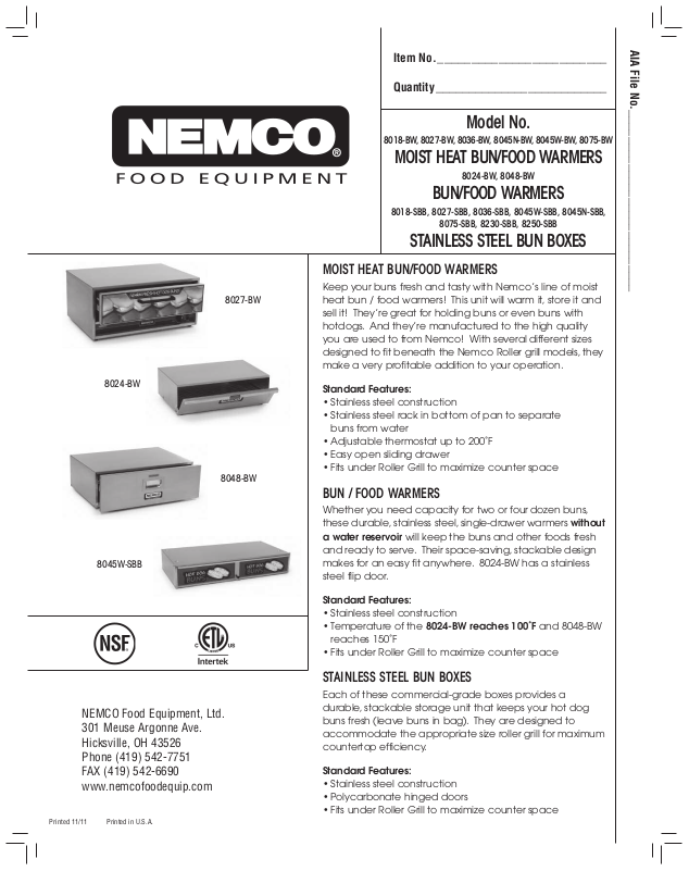 warmers shall be ETL and National Sanitation Foundation listed. The Bun/Food Warmers shall be ETL and National
