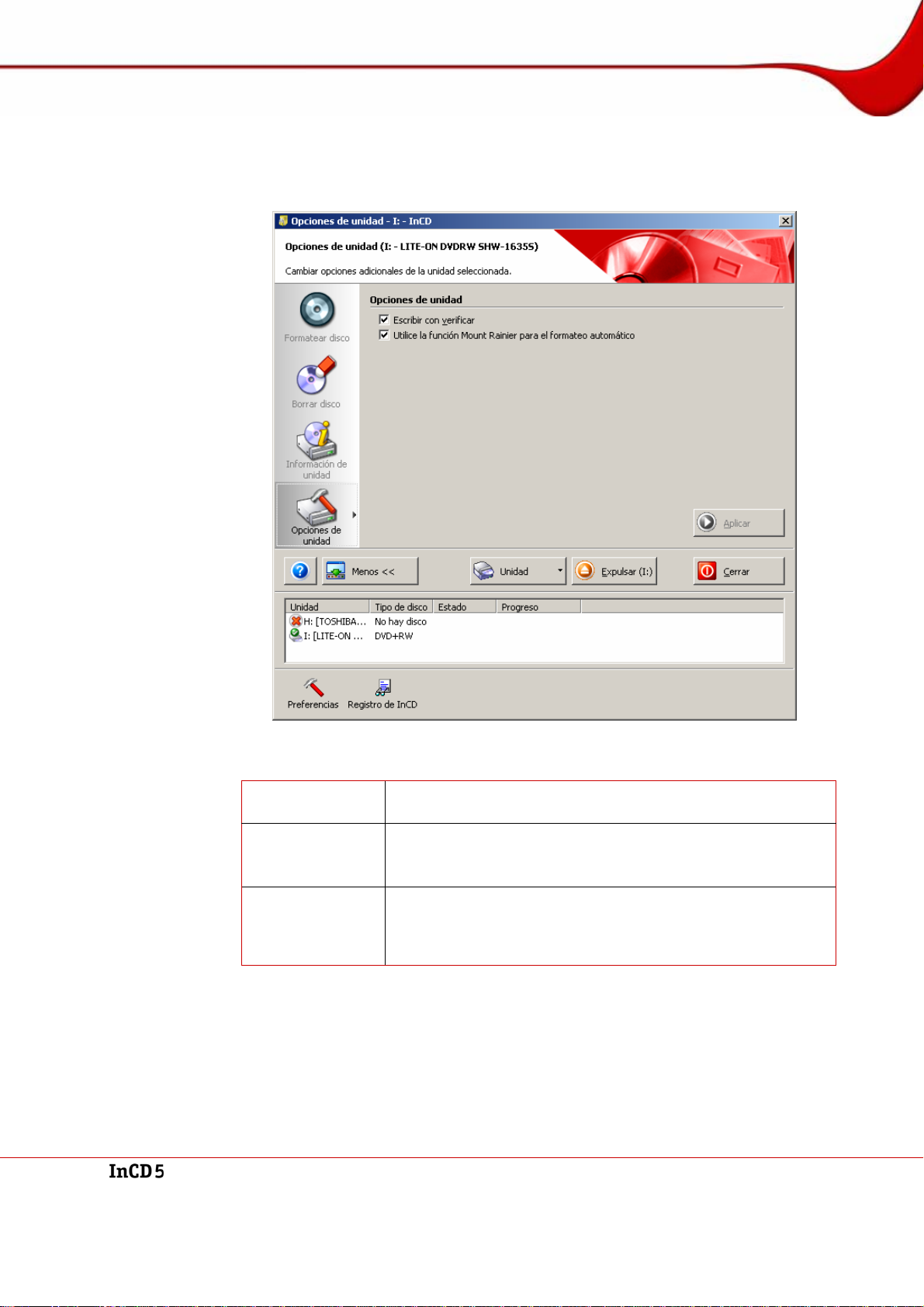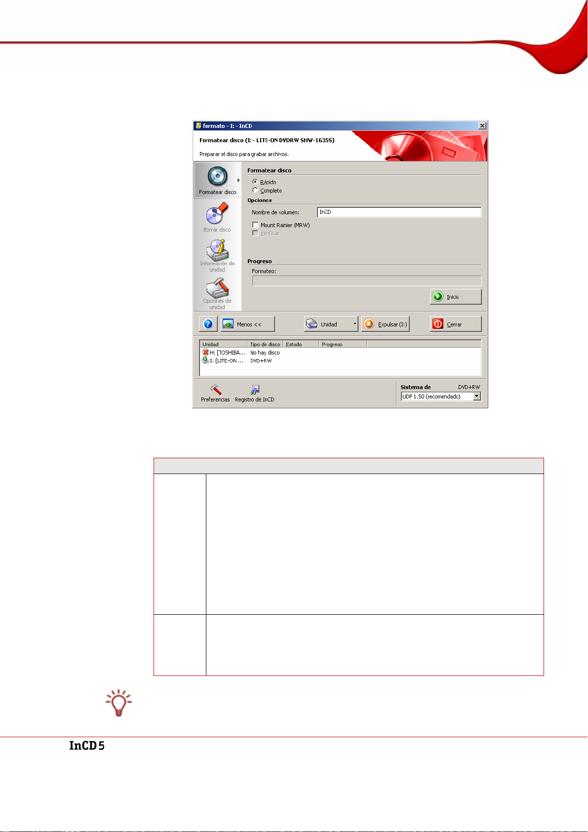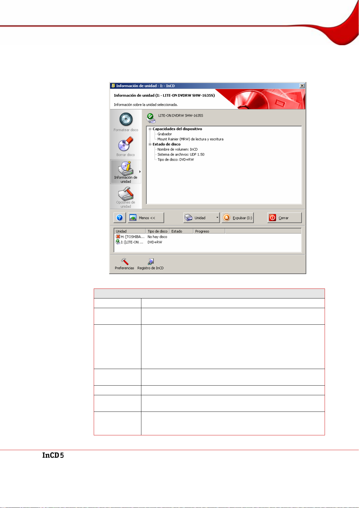 puedan utilizarse como discos flexibles grandes. Puede copiar archivos en el disco arrastrándolos y soltándolos con Windows® Explorer® o guardarlos en el disco desd e otras aplicaciones. InCD utiliza el sistema de archivos UDF y es compatible con el lector UDF en