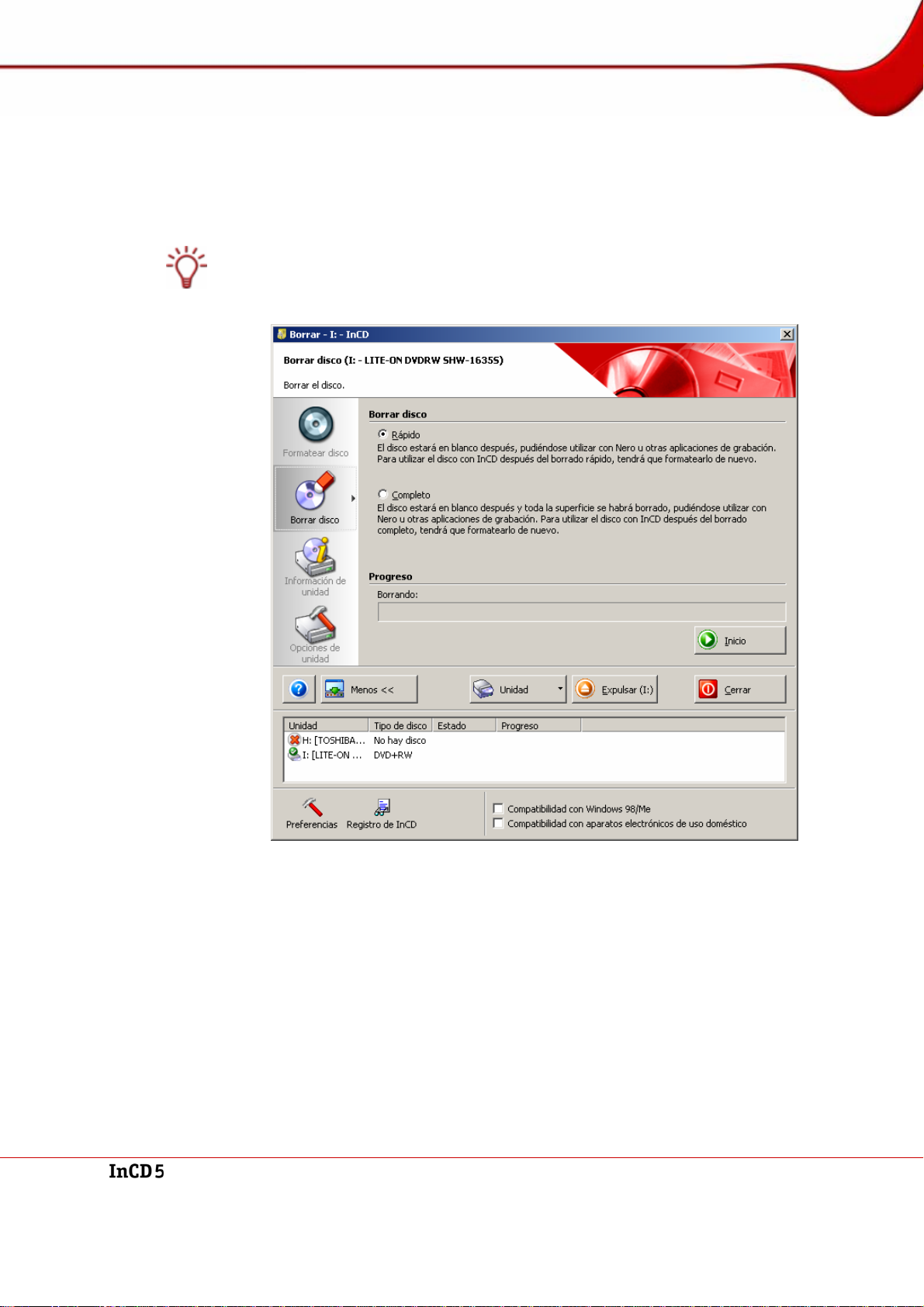 También puede borrar datos de un disco formateado con InCD, igual que los borraría de un