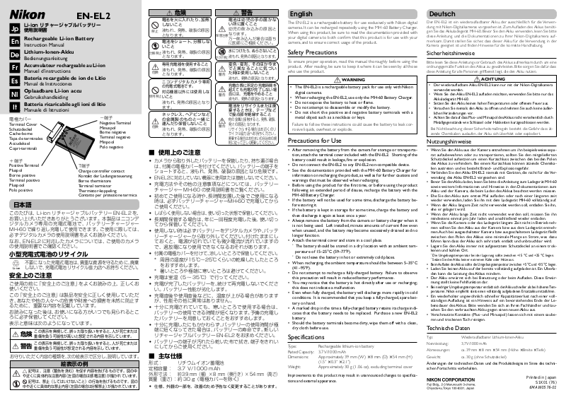 • L’EN-EL2 è una batteria-alimentatore ricaricabile, destinata esclusivamente all’uso con la fotocamera digitale Nikon.