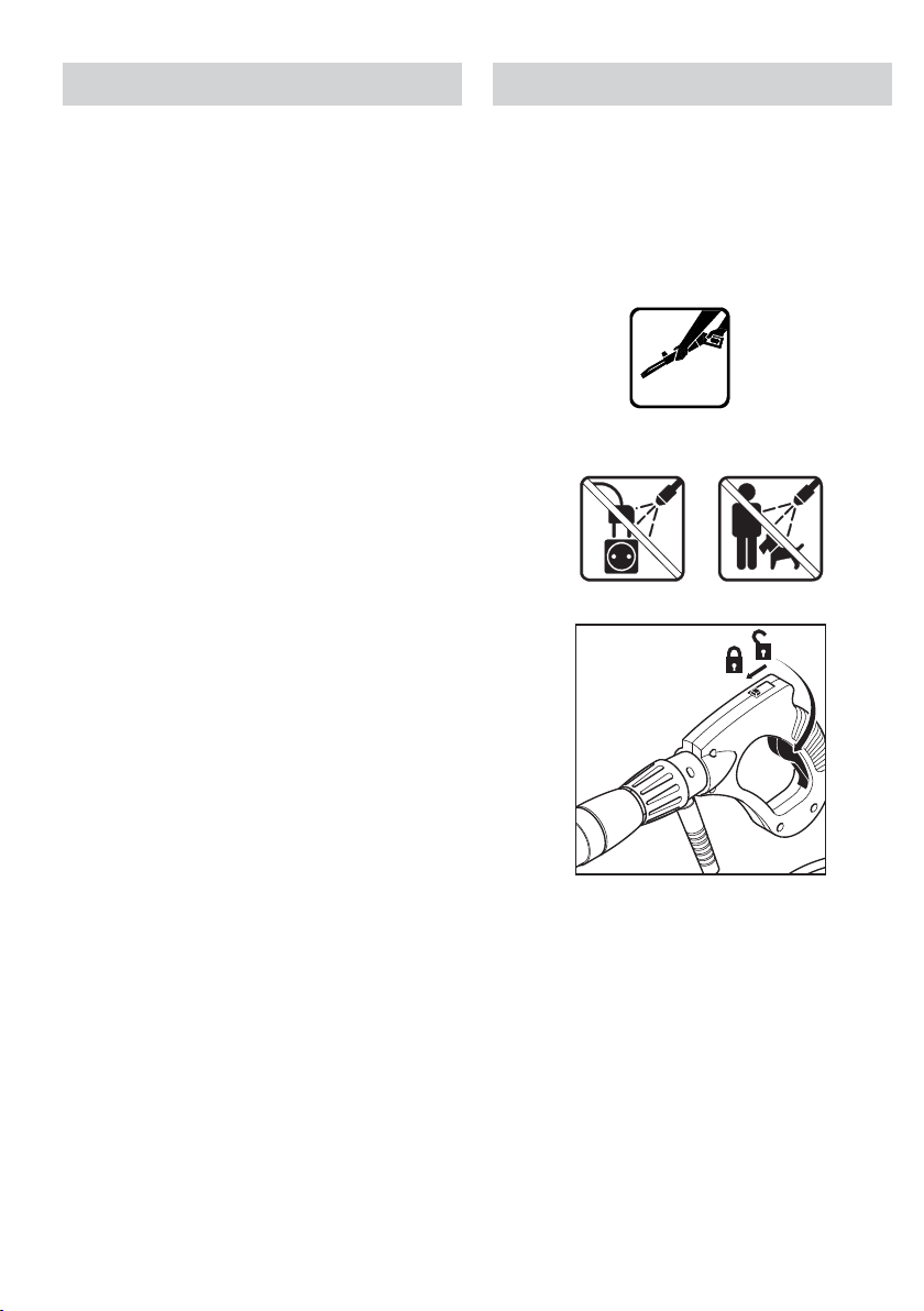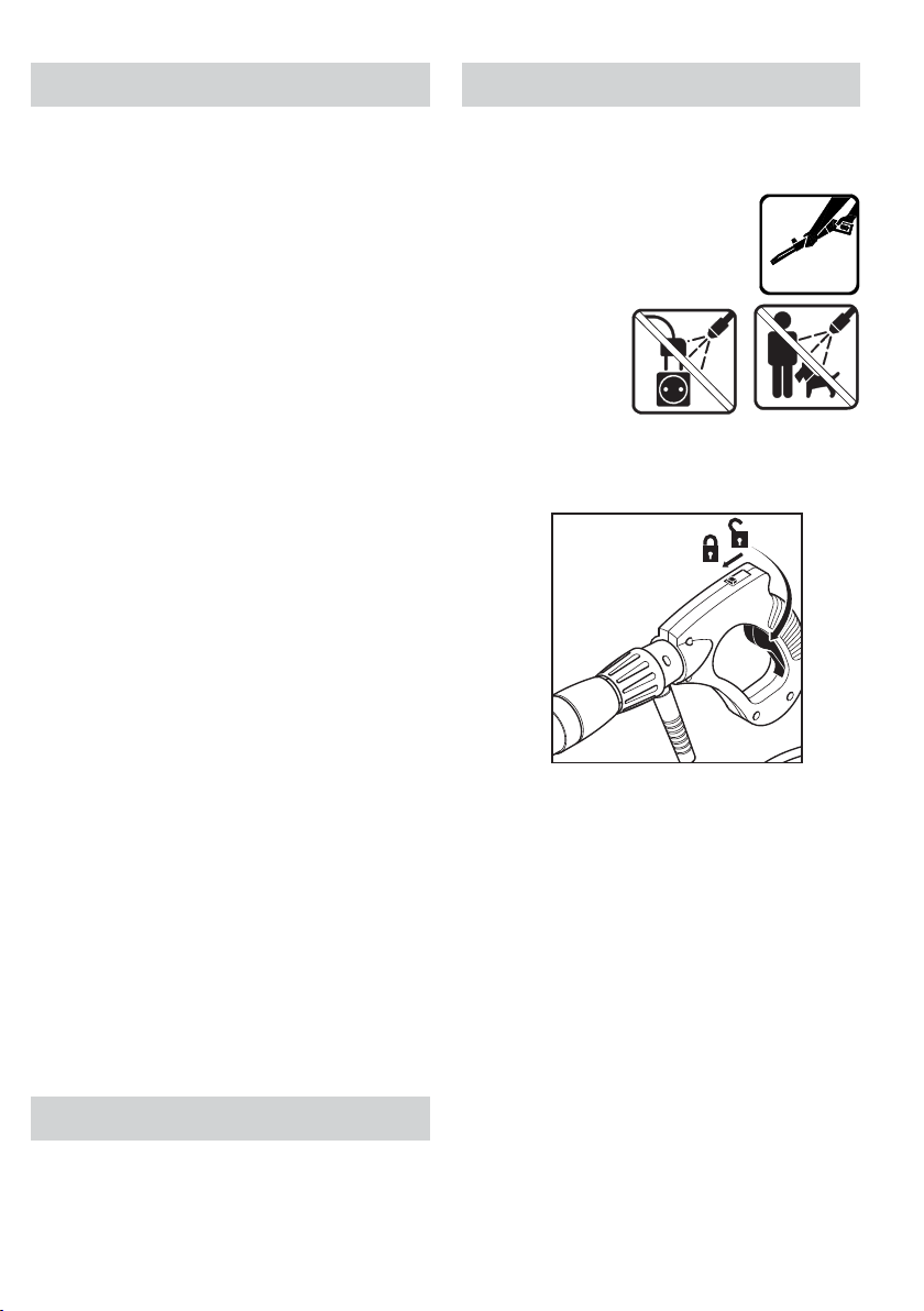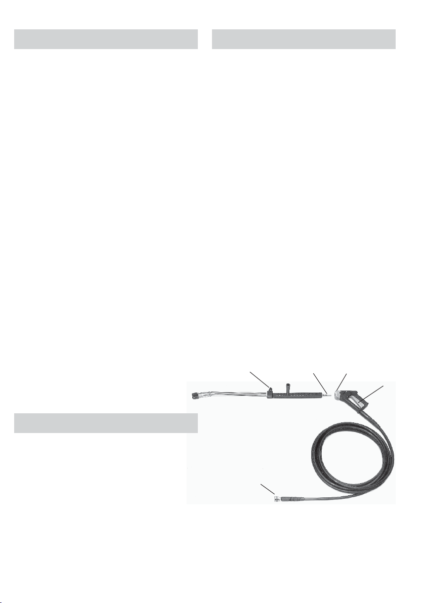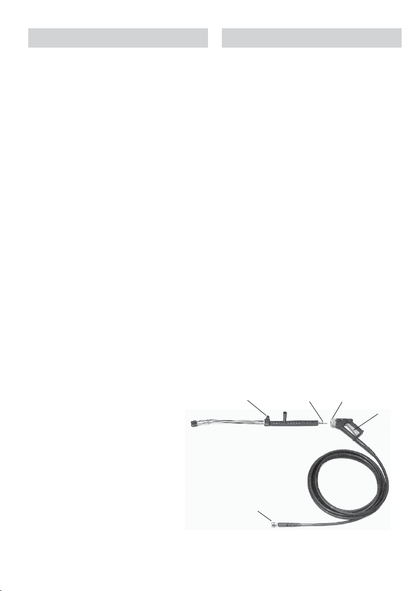 7. Højtryksspuling foretages ved at trykke spulehåndtagets udløser i bund, når reduktionsventilen (e) er lukket.