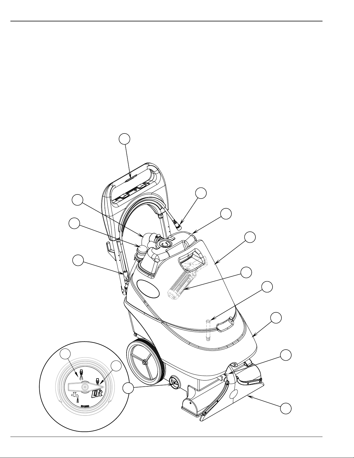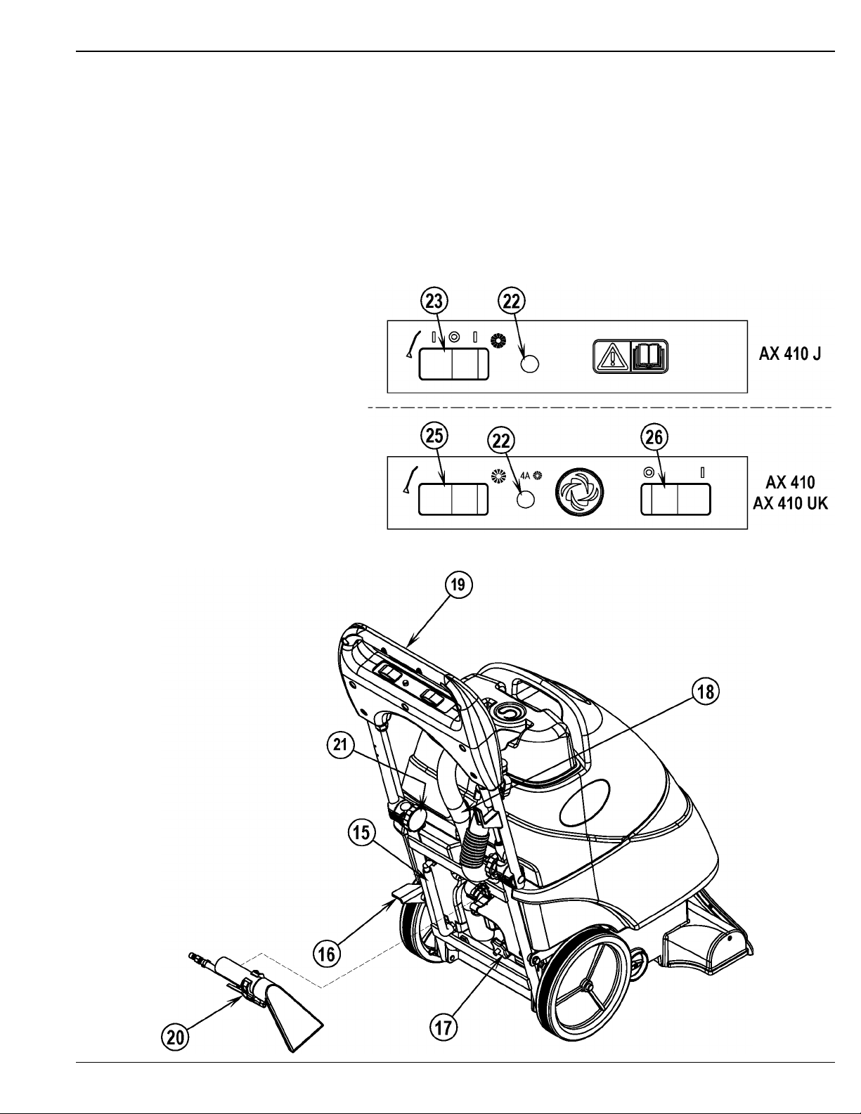 Прерыватель цепи (20) расположен в Панели управления; он предохраняет электрическую цепь и мотор щетки от повреждения в условиях