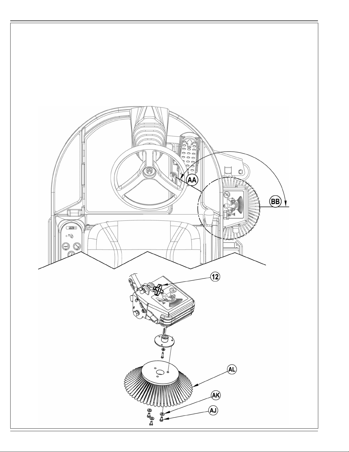 Yan Süpürgeyi (AL) göbeğe tutturan üç altıgen Vida (AJ) ve Pul (AK) ile süpürgeyi sökün.