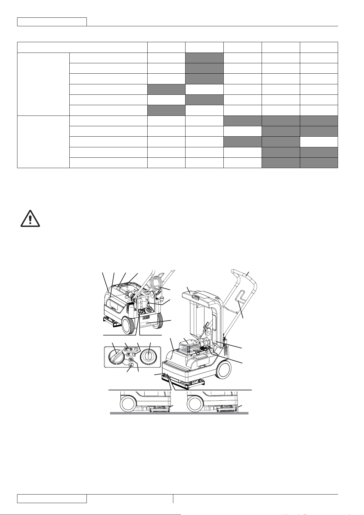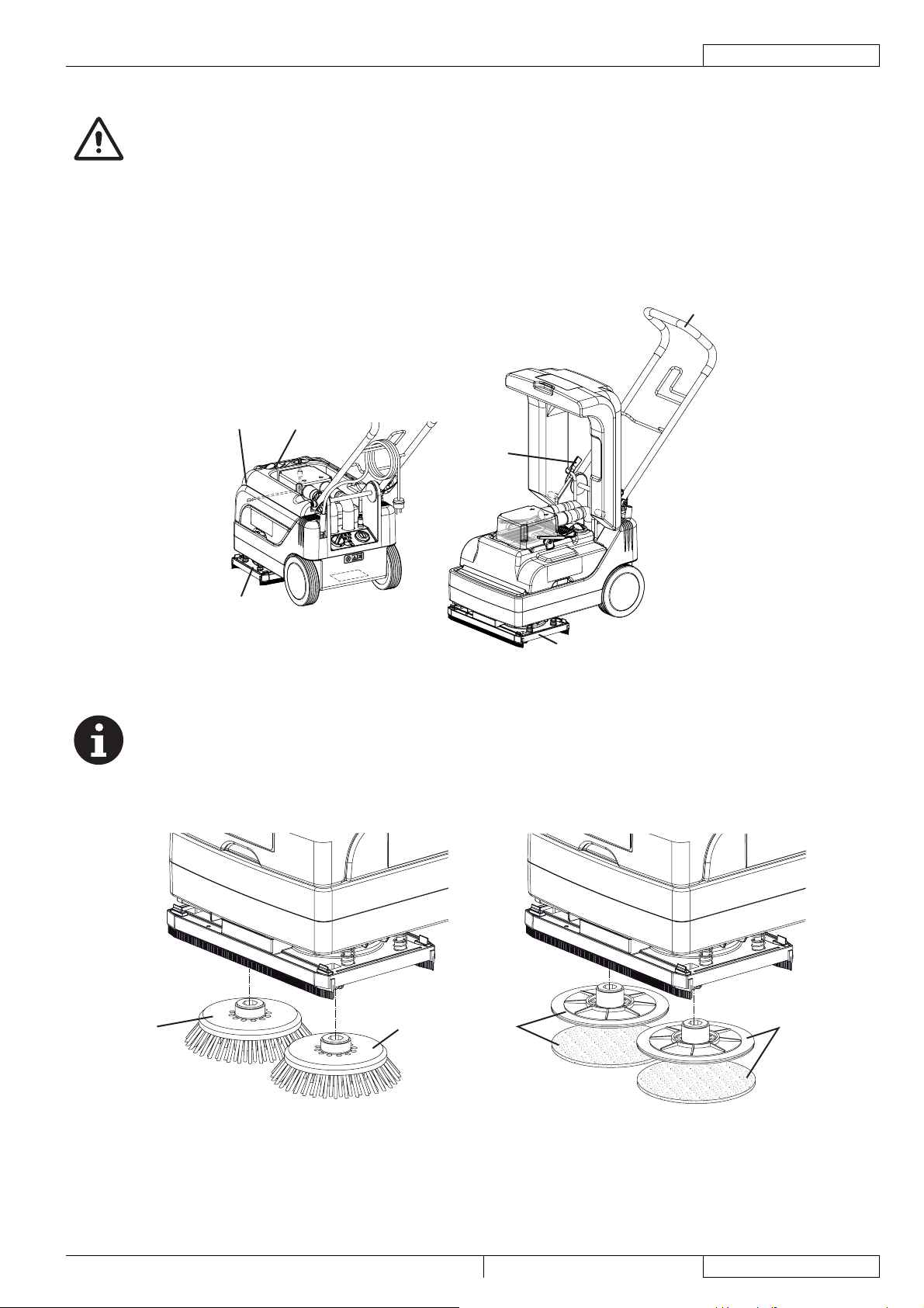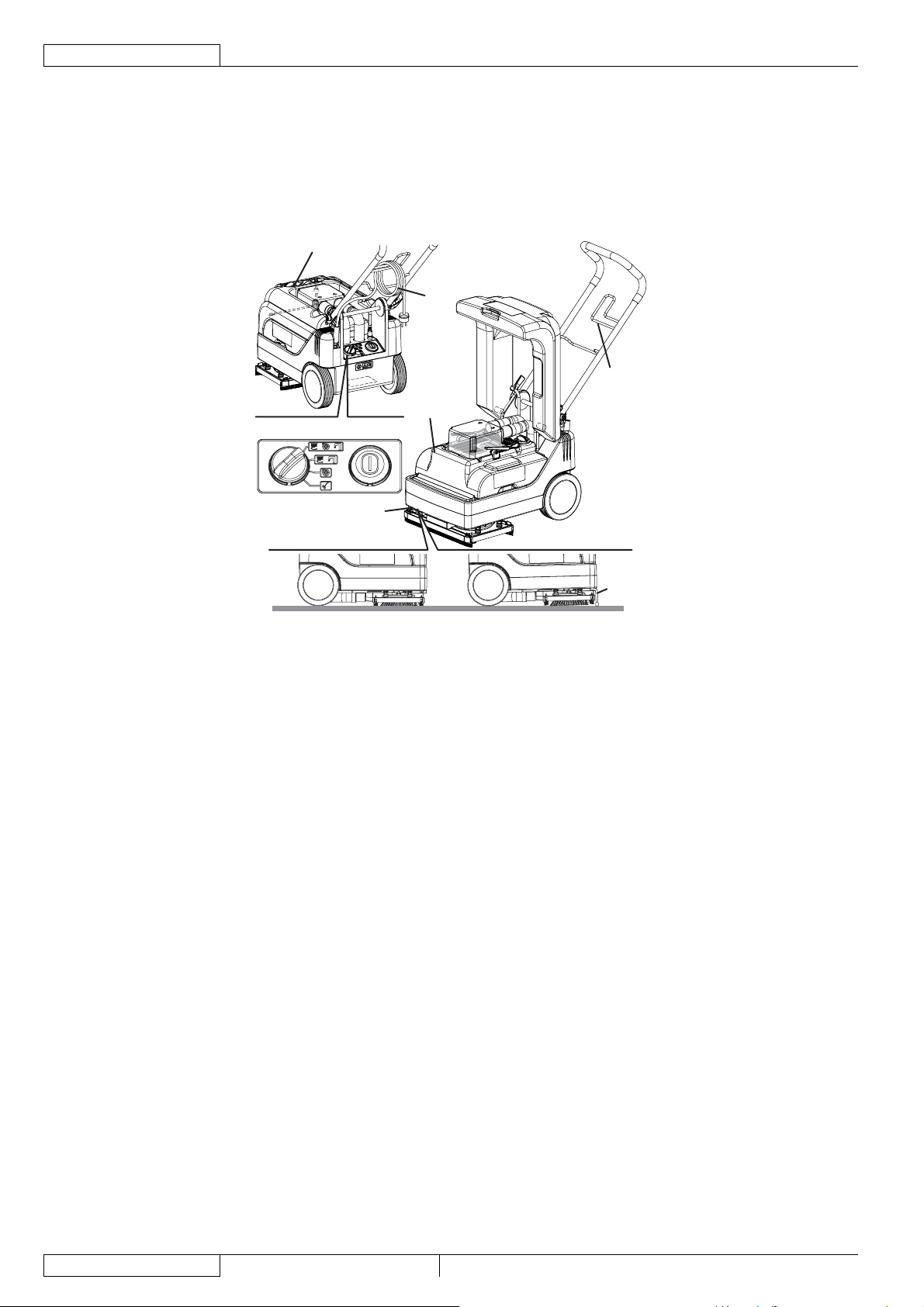 U kunt het schrobdek voor de borstelhouder/trekkers inschakelen door de machine met het stuur (2) omhoog te zetten.
