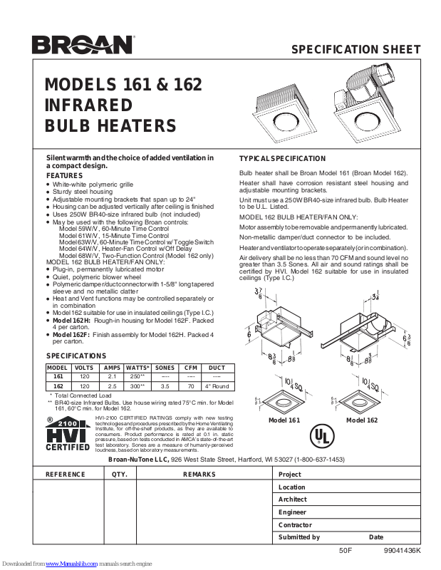 Bulb heater shall be Broan Model 161 (Broan Model 162).
