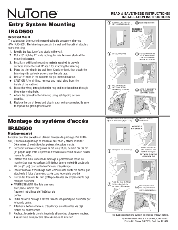 (P/N IRAD-500). The trim-ring mounts in the wall and the cabinet attaches