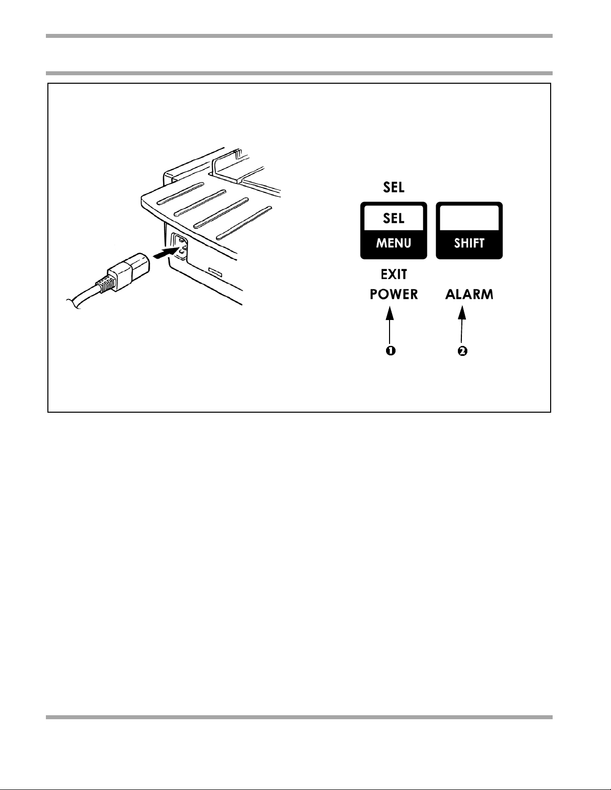 2. Turn the printer on. POWER light (1) comes on and ALARM light (2) comes on because paper