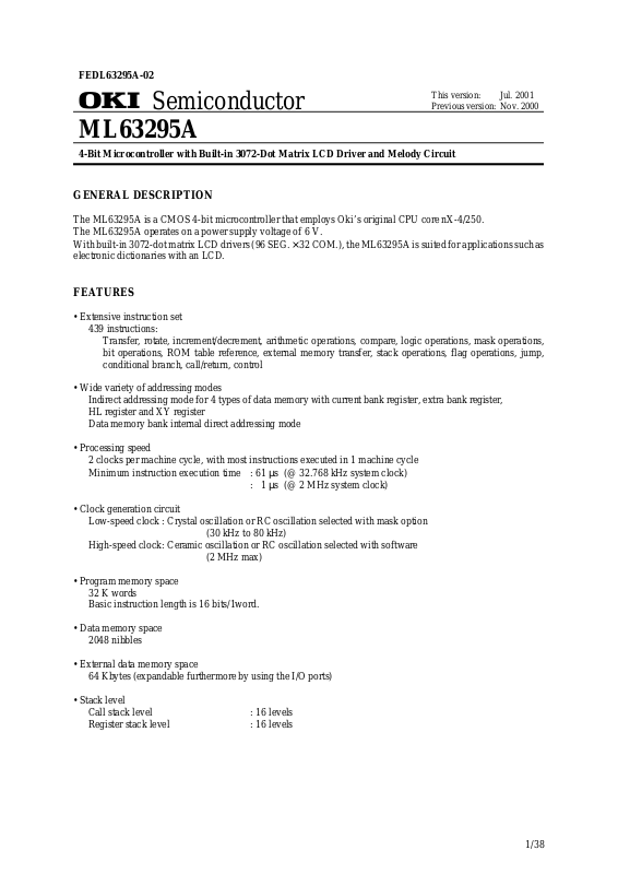 The ML63295A is a CMOS 4-bit microcontroller that employs Oki’s original CPU core nX-4/250.
