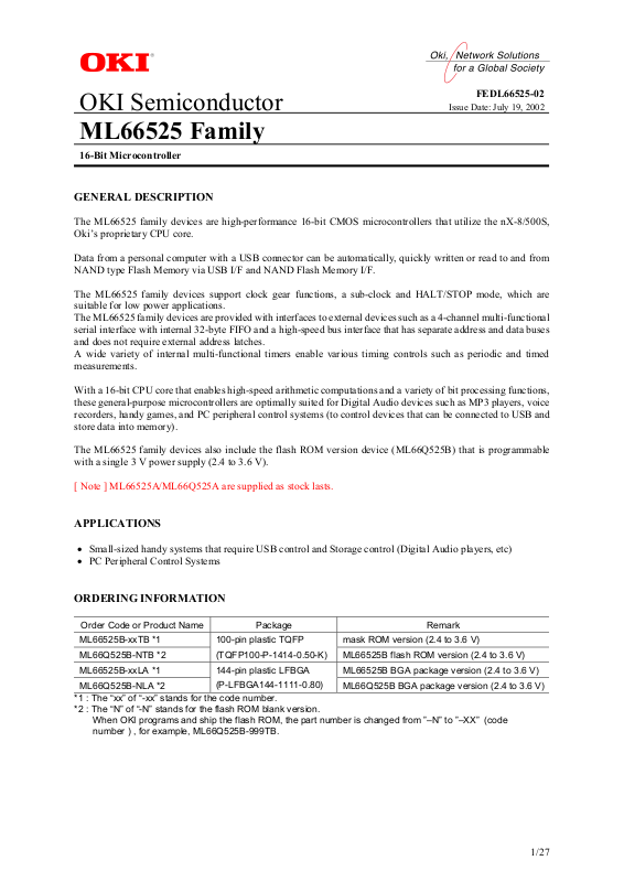 The ML66525 family devices are high-performance 16-bit CMOS microcontrollers that utilize the nX-8/500S,