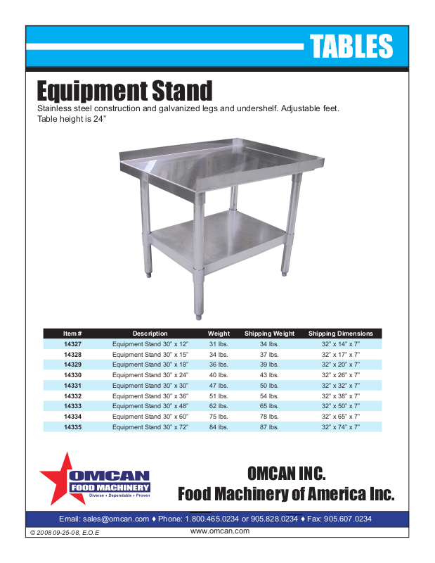 14333 Equipment Stand 30” x 48” 62 lbs. 65 lbs. 32” x 50” x 7”