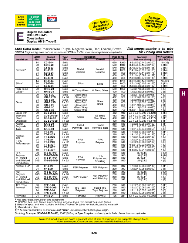 Ordering Example: GG-E-24-SLE-1000, 1000' (300 m) of Type E duplex insulated special limits of error thermocouple wire.