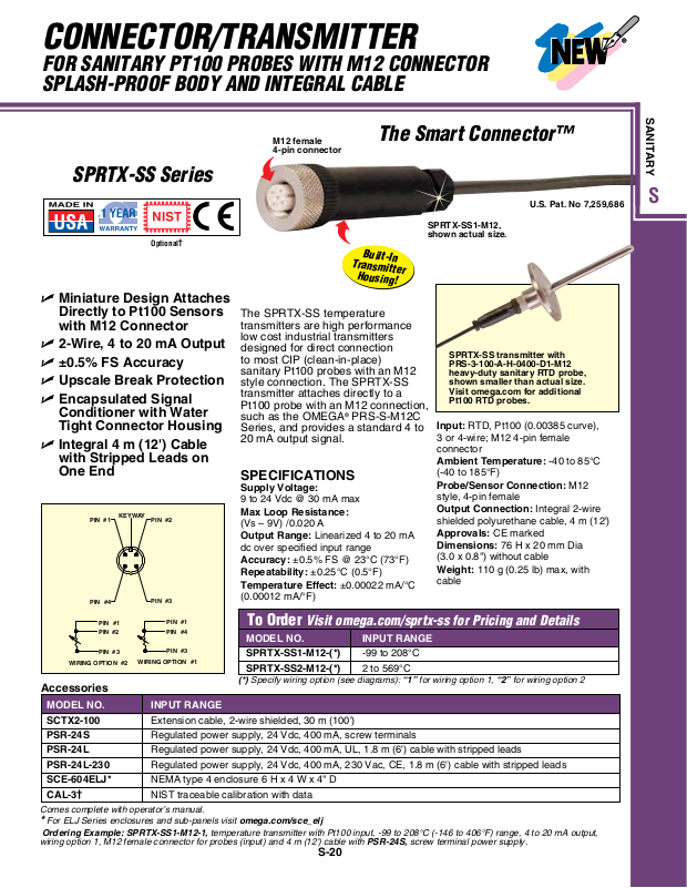 Ordering Example: SPRTX-SS1-M12-1, temperature transmitter with Pt100 input, -99 to 208°C (-146 to 406°F) range, 4 to 20 mA output,