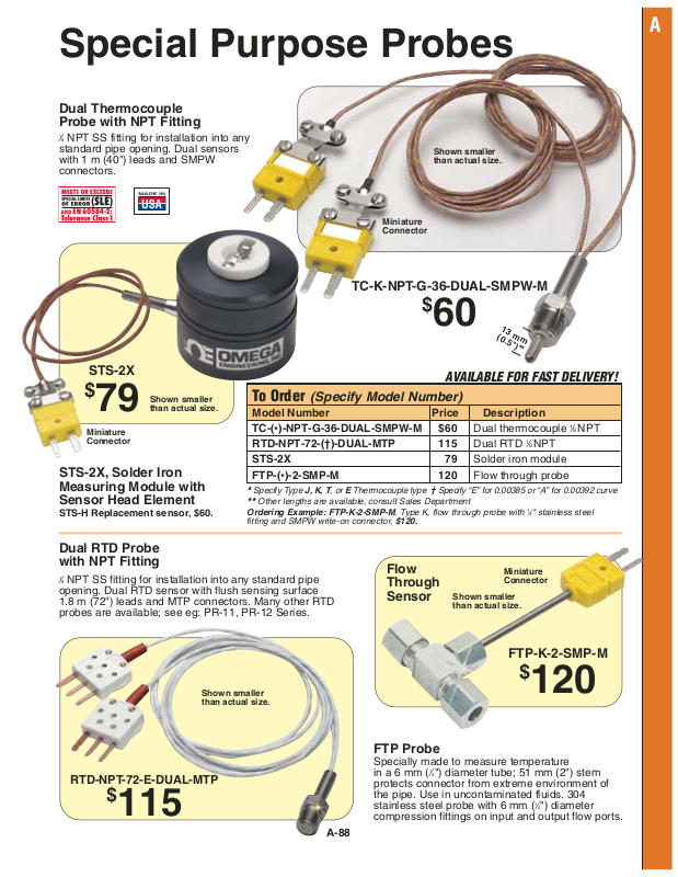 Ordering Example: FTP-K-2-SMP-M, Type K, flow through probe with 1⁄4" stainless steel