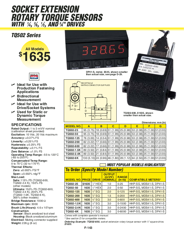 Ordering Example: TQ502-600, socket extension rotary torque sensor with 3⁄8" square drive,