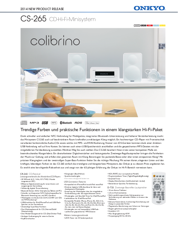 kräftigen, lebendigen Farben ist das CS-265 einfach das trendigste und klangstärkste Minisystem, das Onkyo je zu diesem Preis angeboten hat.