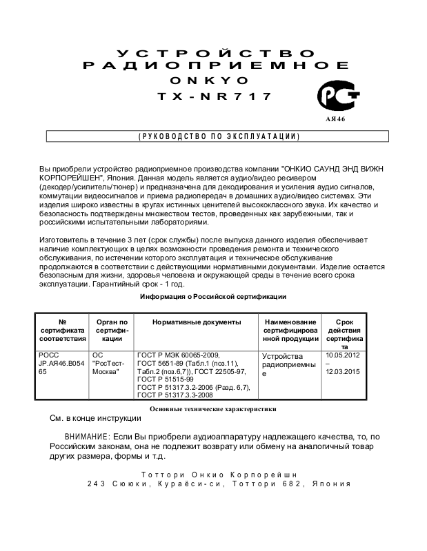 Вы приобрели устройство радиоприемное производства компании "ОНКИО САУНД ЭНД ВИЖН