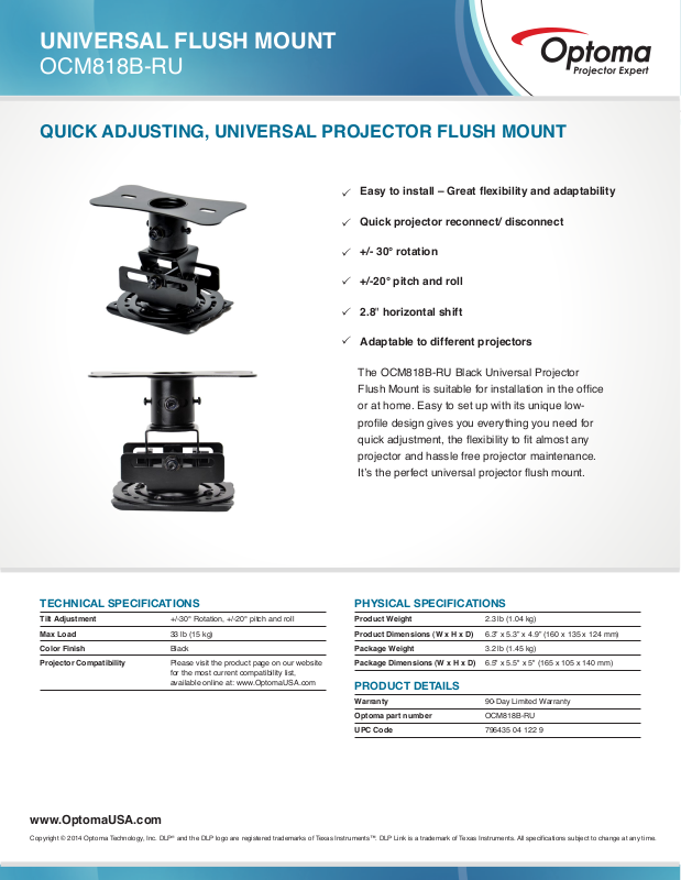 Copyright © 2014 Optoma Technology, Inc. DLP® and the DLP logo are registered trademarks of Texas Instruments™. DLP Link is a trademark of Texas Instruments. All specications subject to change at any time.