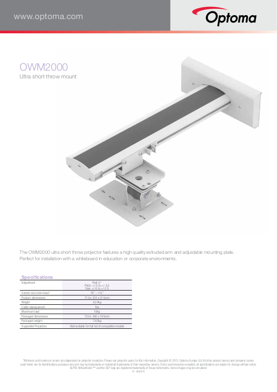 The OWM2000 ultra short throw projector features a high quality extruded arm and adjustable mounting plate.