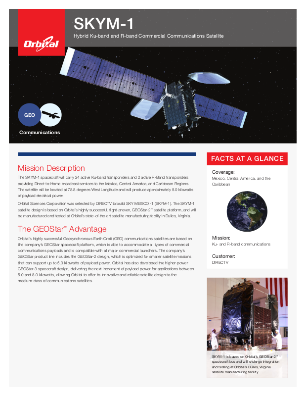 Orbital Sciences Corporation was selected by DIRECTV to build SKY MEXICO -1 (SKYM-1). The SKYM-1