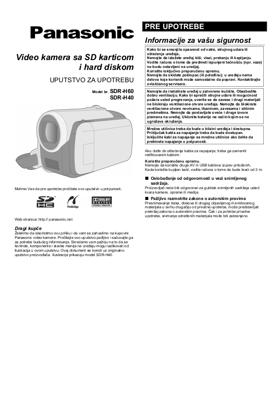 uputstvo proizvođača. Ilustracije prikazuju model SDR-H40.