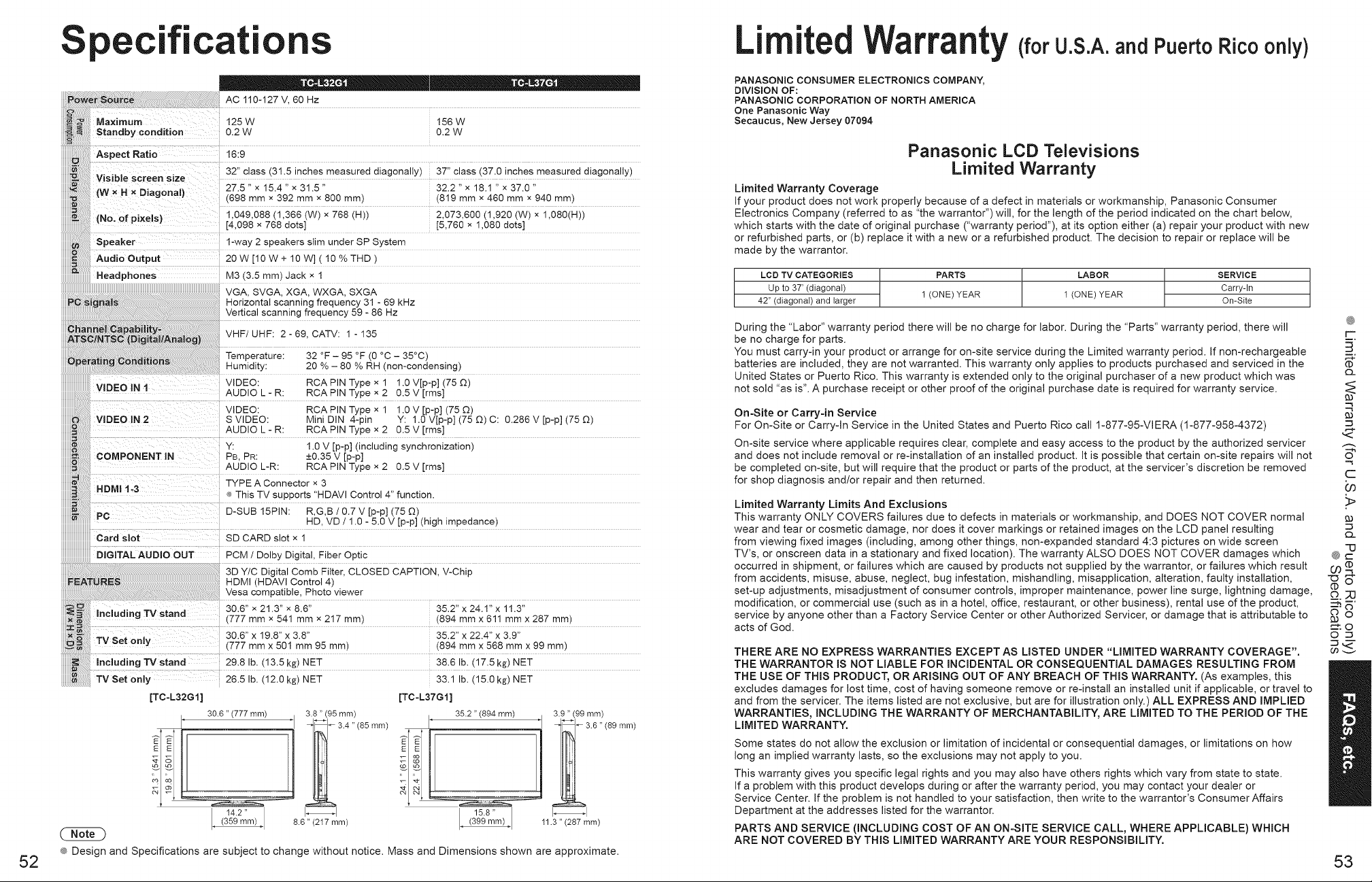 Viera TV (under 42") Carry-in service One (1) year, parts (including panel) and labour.