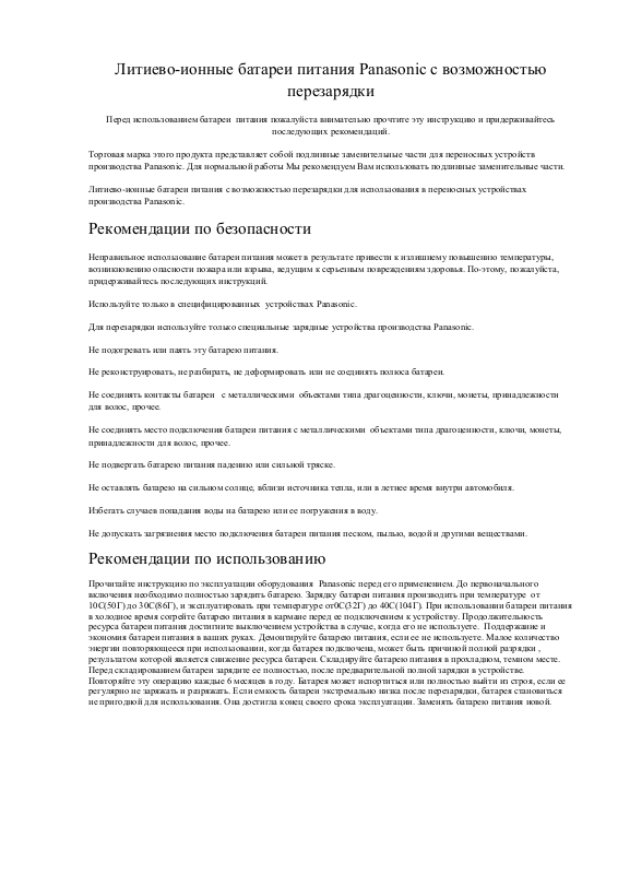Для перезарядки используйте только специальные зарядные устройства производства Panasonic.