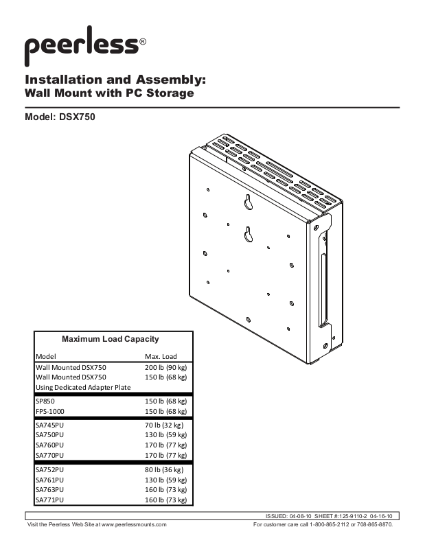 Visit the Peerless Web Site at www.peerlessmounts.com For customer care call 1-800-865-2112 or 708-865-8870.