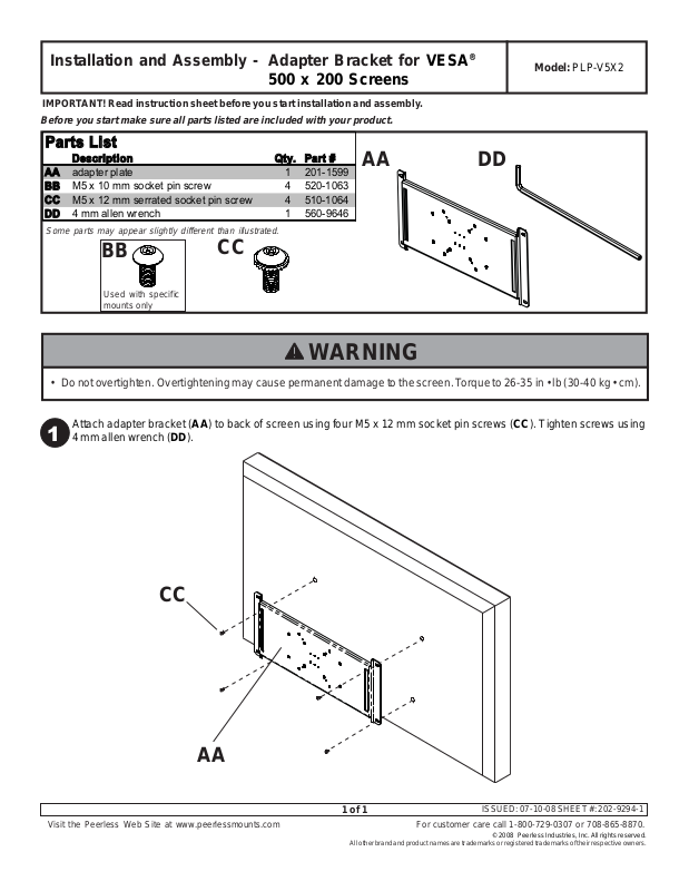 Visit the Peerless Web Site at www.peerlessmounts.com For customer care call 1-800-729-0307 or 708-865-8870.