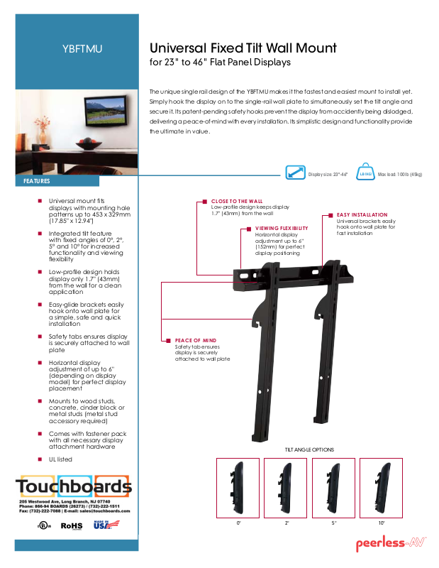 The Universal Fixed Tilt Wall Mount shall be a Peerless-AV model YBFTMU and shall be located where indicated on the plans.