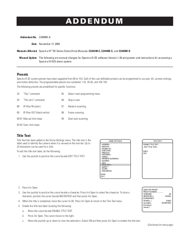 Manual UpdateThe following are manual changes for Spectra III SE software Version 1.28 and greater and instructions for accessing a