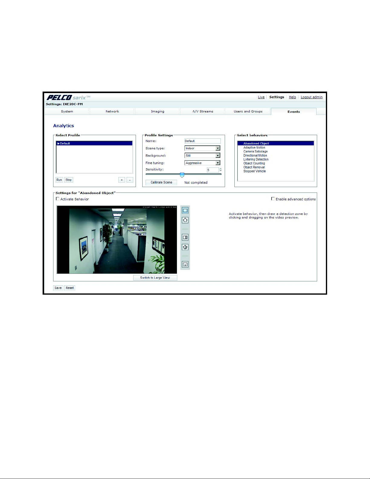 Pelco analytics are configured and enabled using a standard Web browser. The behaviors are also compatible with Endura