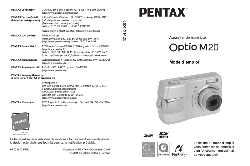 Merci d’avoir fait l’acquisition de cet appareil numérique PENTAX.