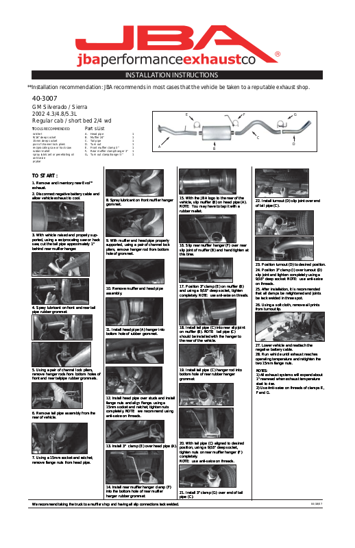 **Installation recommendation: JBA recommends in most cases that the vehicle be taken to a reputable exhaust shop.